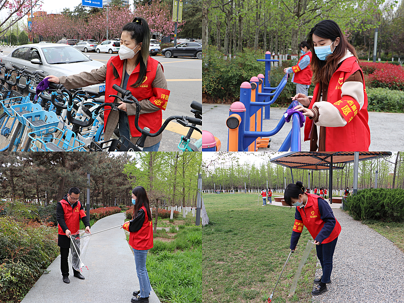 志愿者們身著紅馬甲,帶著抹布、水桶、垃圾夾等工具,分成兩隊(duì),分區(qū)域?qū)珗@衛(wèi)生進(jìn)行大掃除。在公園步道,大家一絲不茍地?fù)焓爸缆放浴⒉輩仓械募埿肌⑺芰洗蜔燁^等生活垃圾,對公園座椅和花壇上的塵土進(jìn)行擦拭,營造整潔環(huán)保的公園環(huán)境;在健身器材區(qū)域,志愿者們用抹布一遍又一遍地對走步機(jī)、爬梯和雙杠等器材進(jìn)行清理,讓群眾使用起來更加便利;在人行道上,志愿者們將隨意停放在路邊的共享單車進(jìn)行統(tǒng)一整理,逐一搬至規(guī)定的停放區(qū)域,做文明的騎行者、停放者和宣傳者,營造綠色文明出行環(huán)境。