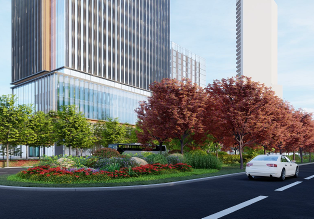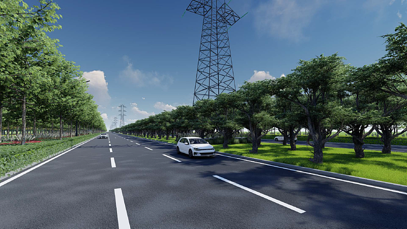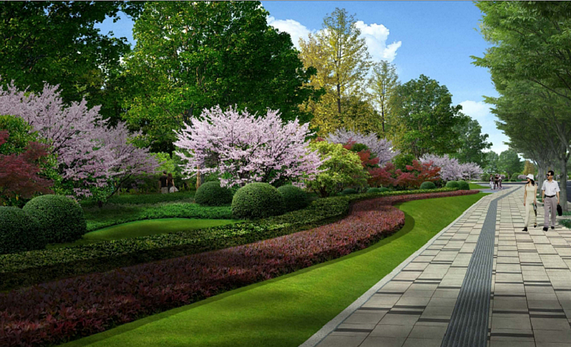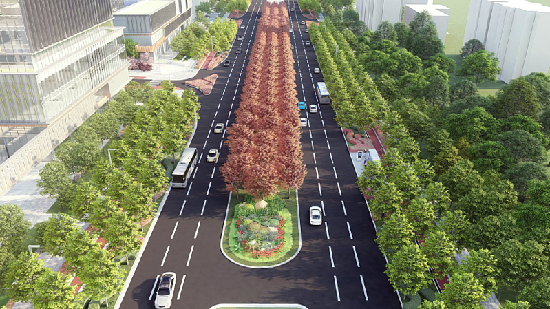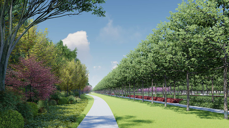 為城市主干路景觀配套,全長1.6公里,綠化面積約9萬平方米。該路段通過栽植高大喬木法桐、油松、國槐等鄉土樹種,端頭點綴組團植物群,致力于構建自然生態的植物景觀,營造休閑舒適的品質街景。計劃于2023年完成相關區域地形整理及綠化栽植施工。