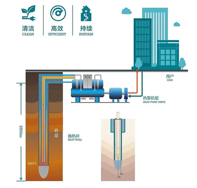 “地熱能作為一種儲量豐富、分布廣泛的可再生能源,環保且經濟。”陜西西咸新區灃西新城能源發展有限公司(以下簡稱“灃西能源公司”)負責人說。中深層地熱地埋管供熱技術是灃西新城探索的一種新型綠色供熱技術,其原理是通過鉆機向地下2—3千米深處鉆孔,在鉆孔中安裝封閉的金屬套管換熱器,通過換熱介質導出地下熱能,并通過地面熱泵機組、輸配系統向地面建筑物供熱。該技術“取熱不取水”,實現了地熱資源低影響開發、高效率利用。