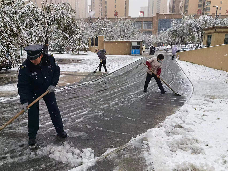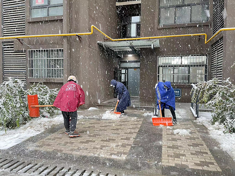 雪景雖美,但出行不易。服務公司組織人員重點對小區、園區、學校主干道、樓棟門口、地庫入口等區域進行清掃,檢查搶修相關設施設備,志愿者們主動參與,及時清除屋頂、雨水管、排水溝等積雪,協力保障業主、師生出行安全暢通。大家分工明確,配合默契,堅守在除雪一線,展現出了物業人的擔當作為。