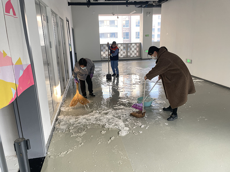 作為校園服務管家,片區工作動態性強,每一項服務都有很強的時效性要求,特別是一些突發天氣情況。1月16日,2024年第一場大雪如期而至,服務公司學校片區迅速組織各業務口工作人員開展除雪保暢活動。大家齊心協力,合作分工,在教學樓各大廳門口鋪設防滑墊,使用干拖布及時打掃腳底帶入的水漬,防止有學生因地面濕滑而摔倒,并迅速清理出校園主干道。第二日上班前,再次將校內有薄冰的地方和道路殘留積雪進行細致清理,全力確保師生方便通行,保障校園安全。