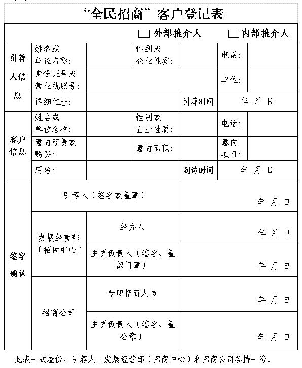 (二)引薦人需將客戶(hù)信息報(bào)至發(fā)展經(jīng)營(yíng)部(招商中心),并持有效身份證件填寫(xiě)《“全民招商”客戶(hù)登記表》(詳見(jiàn)附件),發(fā)展經(jīng)營(yíng)部(招商中心)需在《“全民招商”客戶(hù)登記表》簽字蓋章確認(rèn)引薦信息,并根據(jù)項(xiàng)目招商代理情況,安排招商公司接待客戶(hù)。未進(jìn)行登記的,不得認(rèn)定為引薦人。