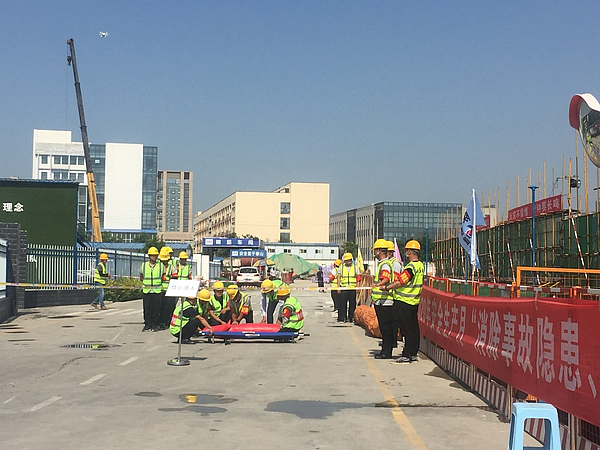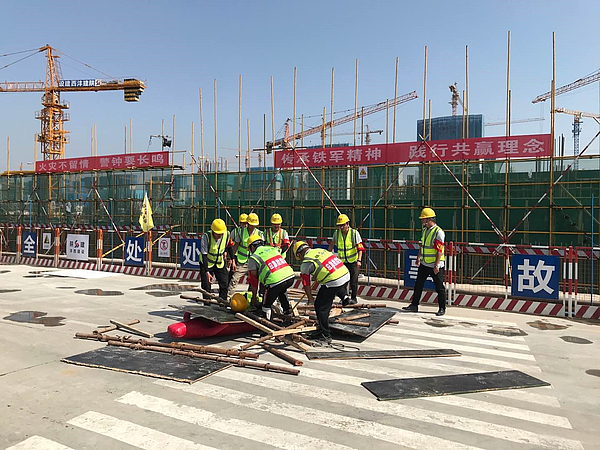 本次演練針對高支模坍塌事故和有限空間作業事故開展應急救援,現場分別模擬高支模架體突然發生坍塌,兩名作業人員被鋼管、模板埋壓的場景和由于作業人員違章操作,在未經審批的情況下,下井作業突然暈倒的場景,事故發生后,現場立即啟動應急預案,在應急指揮部統一調度下,各應急救援組各司其職,分頭行動開展應急救援工作。經過緊張救援,遇險人員被救出,并送往醫院進一步治療。現場救援人員隨即全部撤離,各項演練任務順利完成。