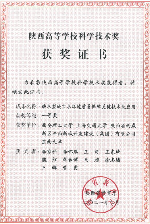 近日,灃西集團海綿城市技術中心與西安理工大學等高校聯合研究課題“缺水型城市水環境質量保障關鍵技術及應用”獲陜西高等學校科學技術獎一等獎。