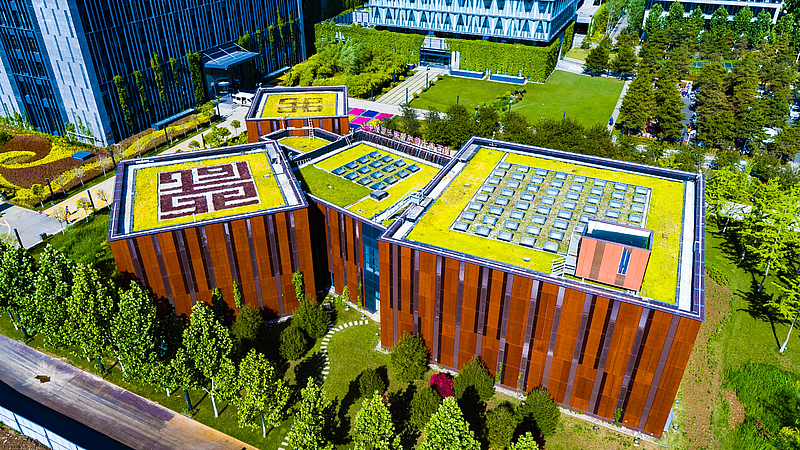 “上樓去散散步吧?!痹诳旃澴嗟默F代社會,很多被困于城市寫字樓內的白領,每天工作間歇最大的奢望,便是下樓找一塊綠地放松放松。然而,在灃西新城西部云谷,白領們只需移步樓頂,便能瞬間完成辦公室到公園的無縫切換。作為建設海綿城市的重要探索,近年來,灃西新城部分園區辦公樓上建設了綠色屋頂。屋頂花園不僅能起到吸收、凈化雨水的作用,同時還能有效減碳吸碳,降霾去熱,成為城市一道稀有景觀。